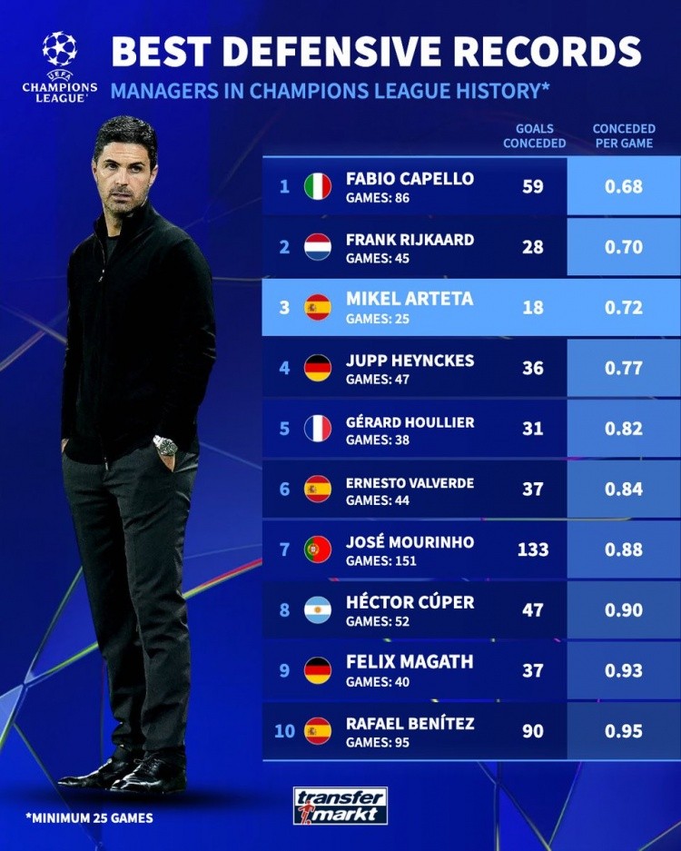 阿尔特塔带阿森纳参加25场欧冠仅丢18球,场均0.72球排在历史第三