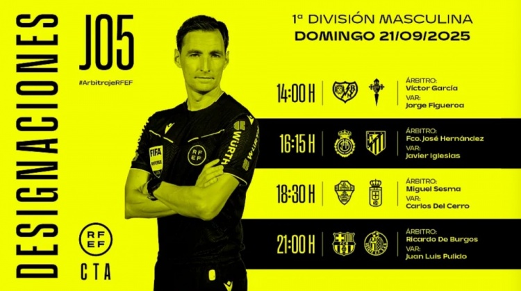 9月20日讯 今天,西班牙足协在官网公布了周日四场西甲比赛的裁判员名单,
